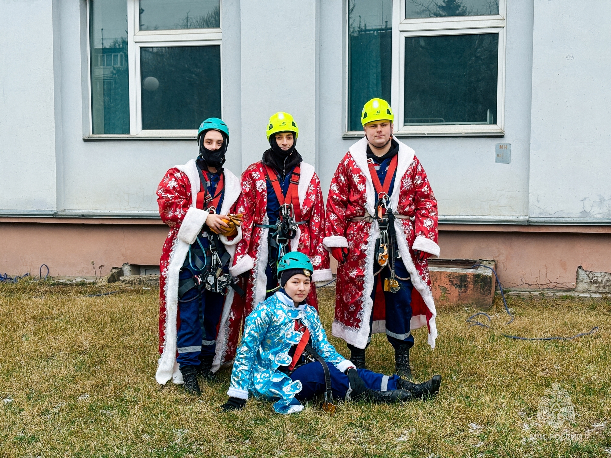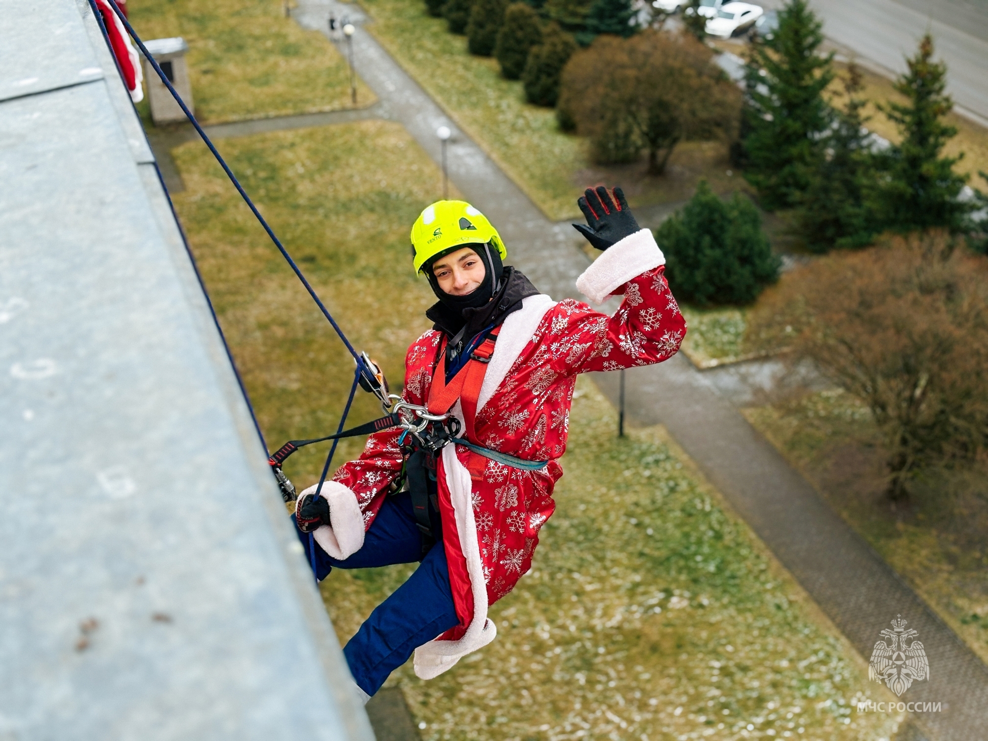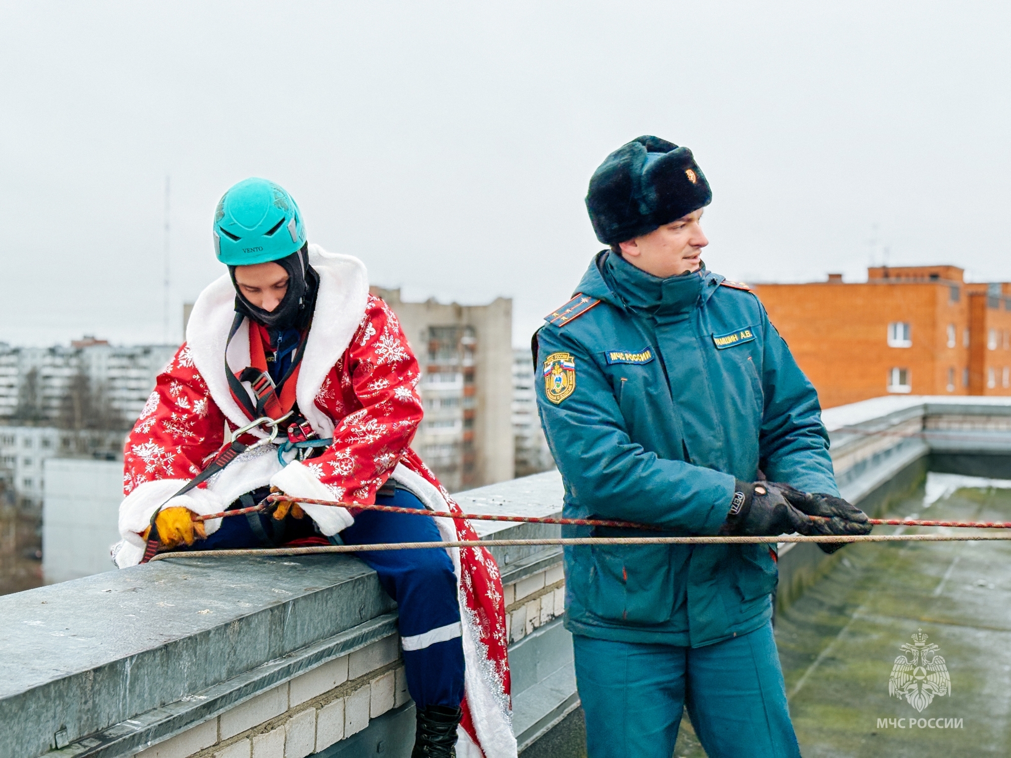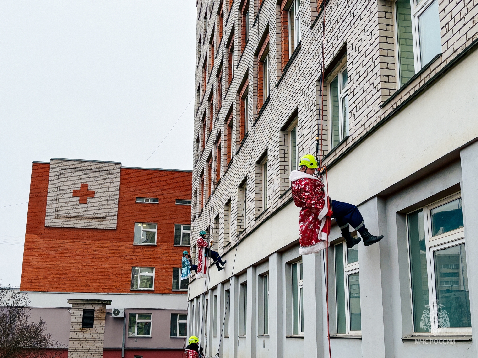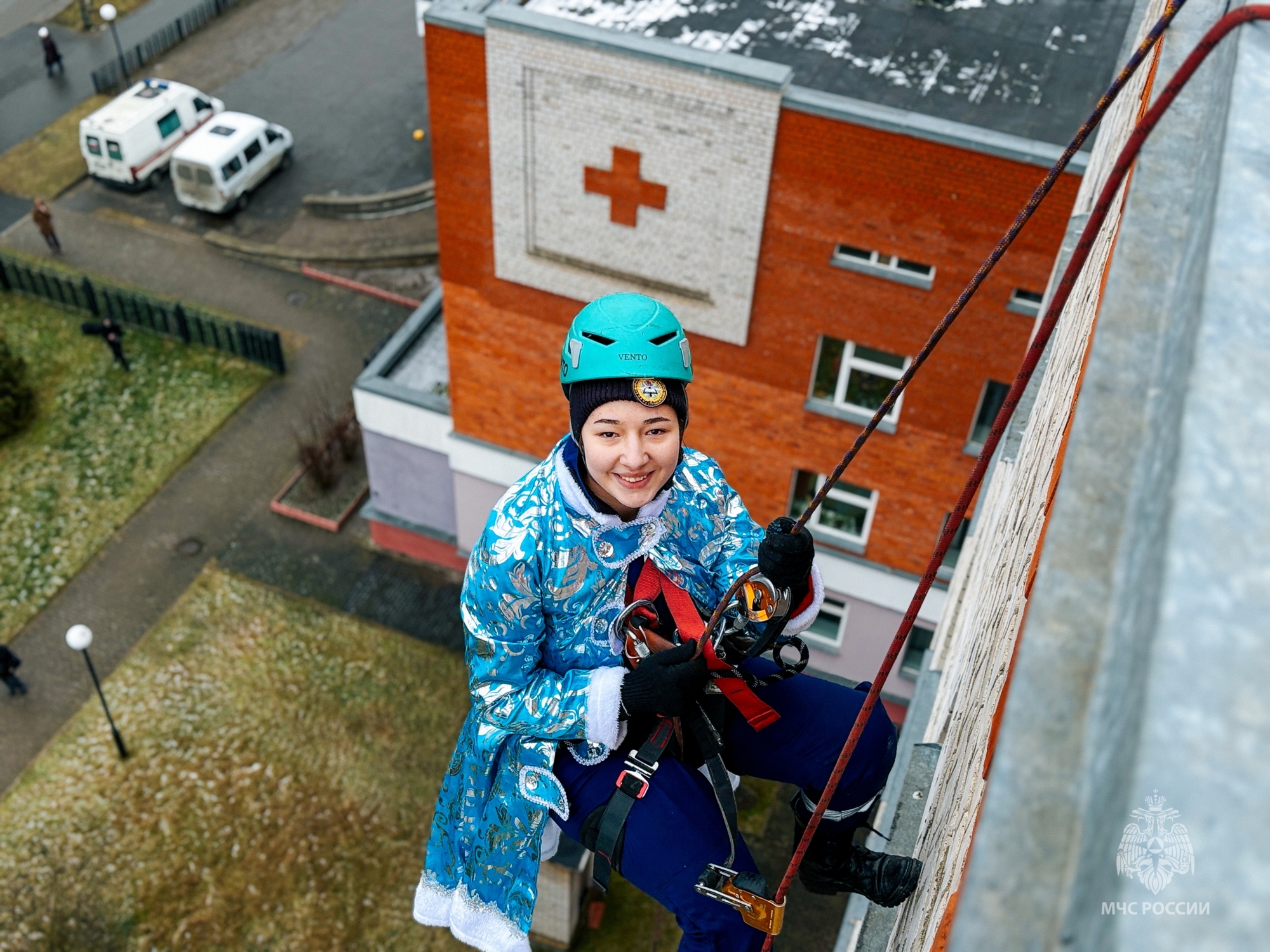 Под руководством сотрудников Главного управления МЧС России по Псковской области добровольцы в костюмах новогодних героев спустились с крыши детской областной больницы с помощью альпинистского снаряжения.