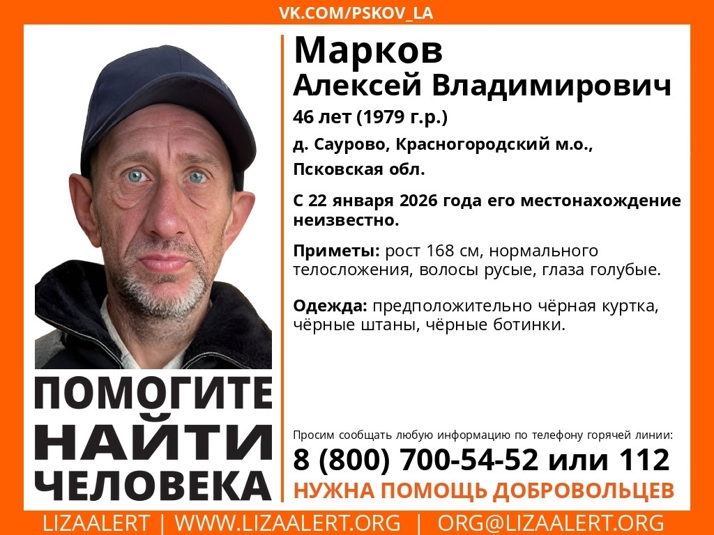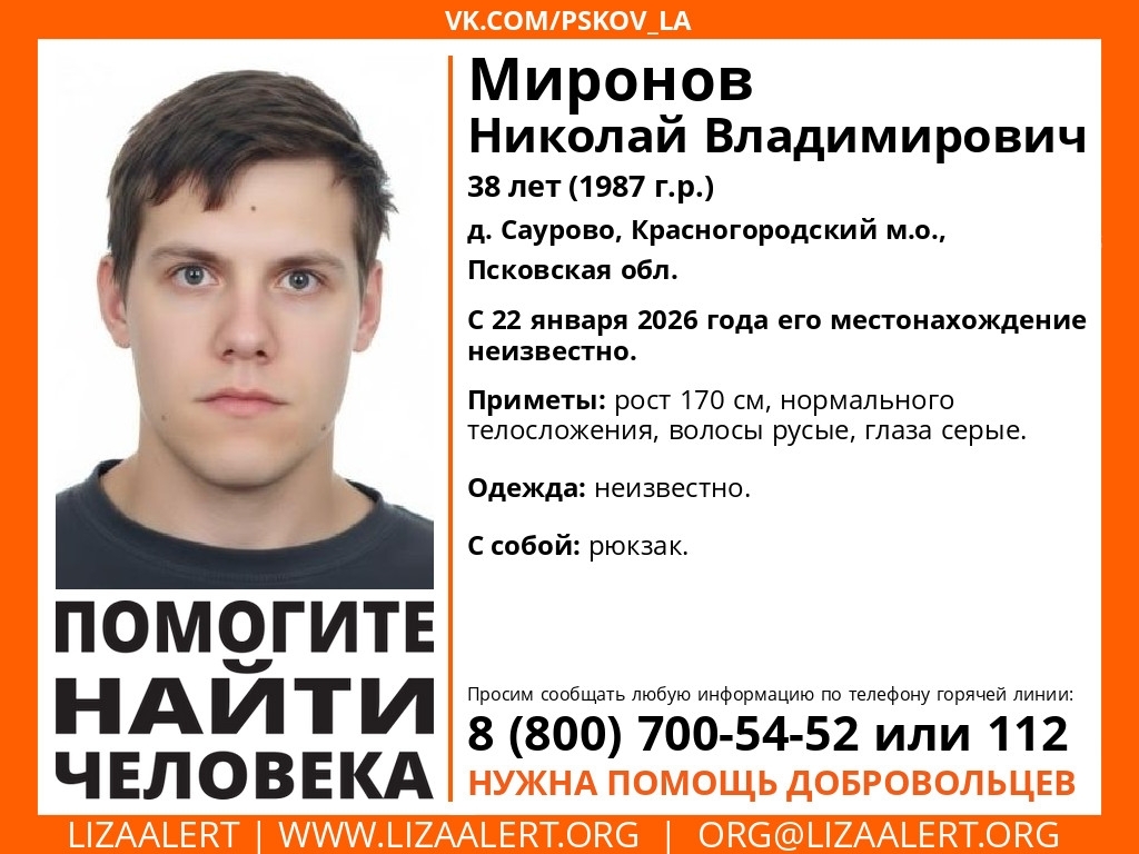 Алексей Марков и Николай Миронов ушли из деревни Саурово Красногородского муниципалитета 22 января. С тех пор об их местонахождении ничего не известно. 48-летний Марков ростом 168 см, имеет нормальное телосложение, русые волосы и голубые глаза. Был одет предположительно в черные куртку, штаны и ботинки. 38-летний Миронов ростом 170 см, тоже имеет нормальное телосложение и русые волосы, а вот глаза у мужчины голубые. Во что он был одет - неизвестно, но при себе был рюкзак.
