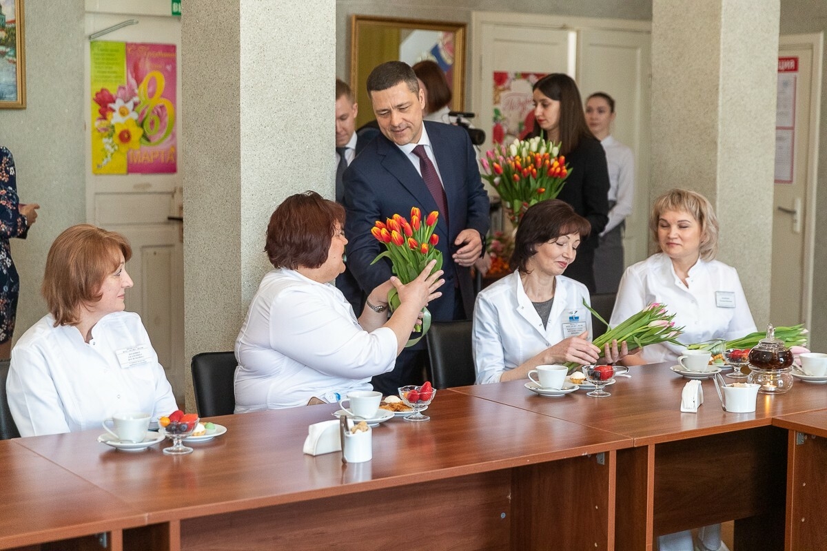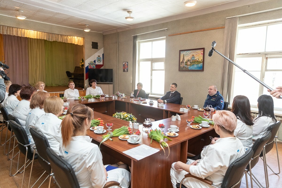 После осмотра лечебного корпуса Михаил Ведерников встретился с женской частью коллектива псковского филиала клинического госпиталя за чашкой чая, чтобы поздравить специалистов с 8 Марта. «В преддверии прекрасного весеннего праздника желаю вам здоровья, счастья и благодарных пациентов. Пообщался с ребятами, все они отмечают хорошие условия, заботливый, доброжелательный персонал. За это вам большое спасибо», — сказал Губернатор. Он также спросил, что еще необходимо медучреждению для стабильной работы.