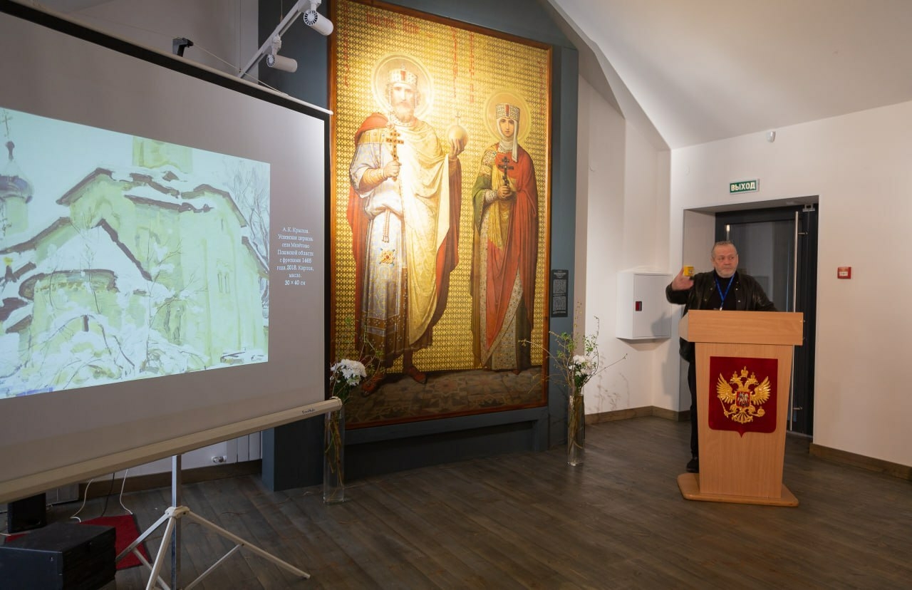 Академик, художник Александр Крылов презентовал собравшимся выставку «Непобедимая красота», которая экспонируется сейчас в выстаовочном зале, и рассказал об уникальных Мелётовских фресках.