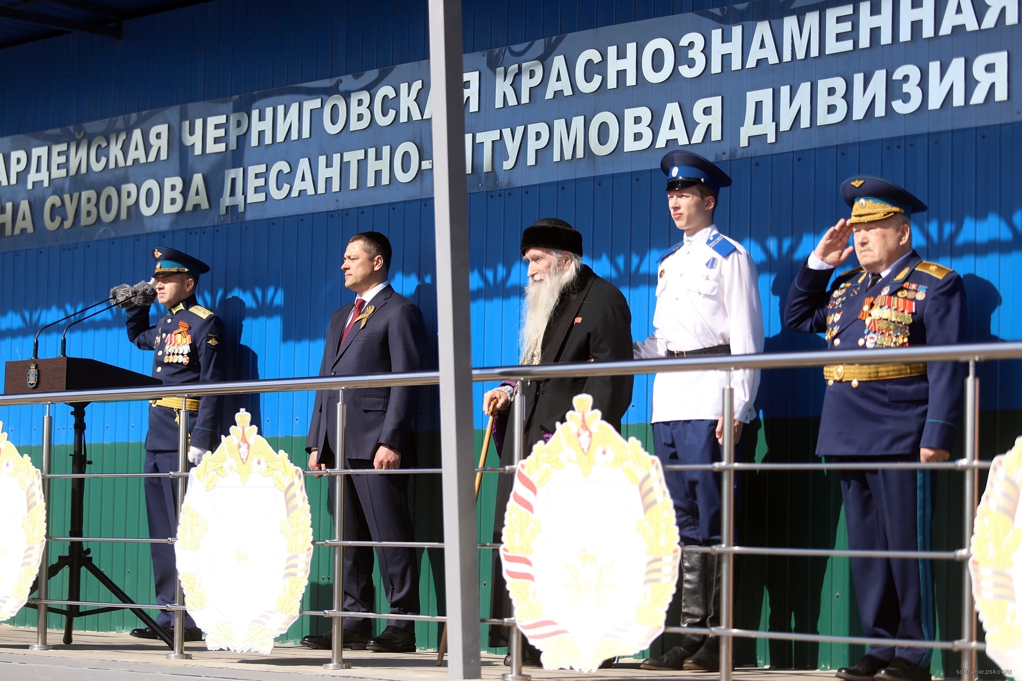 Генерал-майор в отставке, председатель Совета ветеранов дивизии Юрий Соседов назвал День Победы самым главным праздником в году, доставшимся дорогой ценой. «После войны дивизия продолжала выполнять ответственные задачи. Здесь стоящие ветераны участвовали практически во всех горячих точках, начиная с событий в Венгрии, в Чехословакии», - напомнил ветеран ВДВ. Юрий Соседов отметил, что дивизия всегда прекрасно выполняла и выполняет все поставленные перед ней задачи, и обратил внимание, что в рядах Вооружённых сил сейчас стоят дети и внуки ветеранов – продолжатели семейных династий военных. «Я желаю всем побыстрее расправиться с этой коричневой гадиной и вернуться живыми, здоровыми домой. Желаю всему личному составу совершенствовать свои навыки, чтобы быть готовыми в любой момент защитить интересы нашей Родины», - добавил экс-комдив, поздравил всех присутствующих с праздником и пожелал воинам гарнизона здоровья, мягких приземлений и успехов в боевой подготовке.