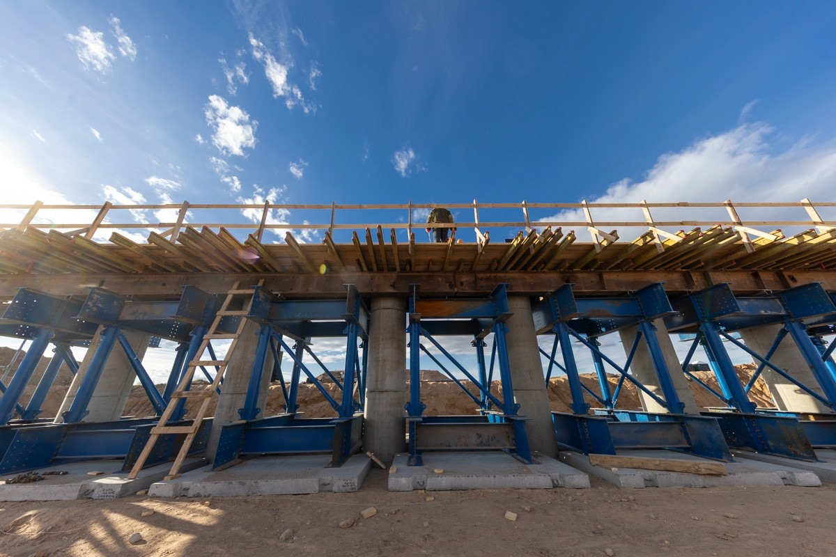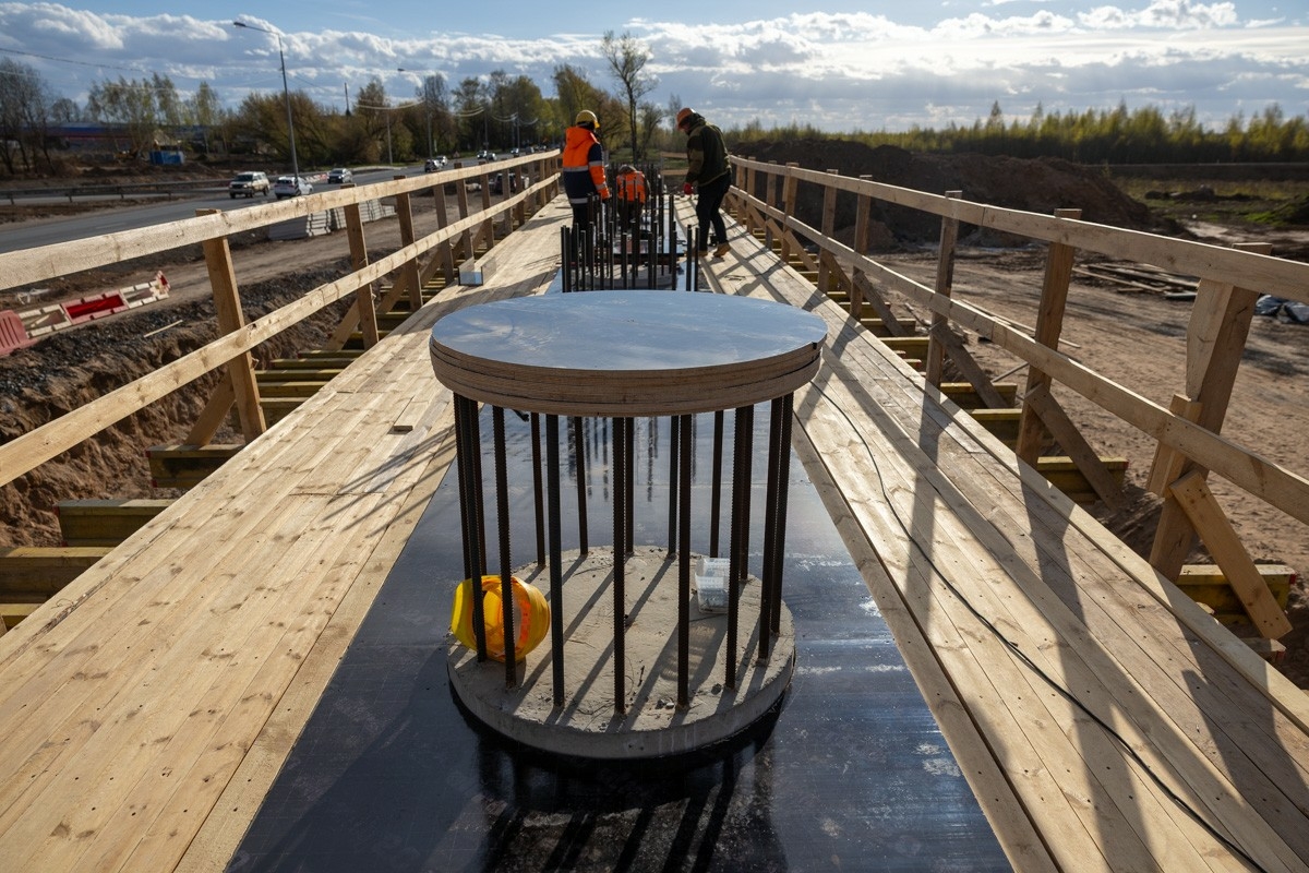 На другом участке Северного обхода строится мост через реку Великая. В настоящее время наиболее активно ведутся работы по возведению русловых четвертой и пятой опор. Всего проектом предусмотрено строительство шести опор. После выполнения надвижки на крайнюю опору моста в деревне Родине строители перейдут к опусканию пролетного строения.