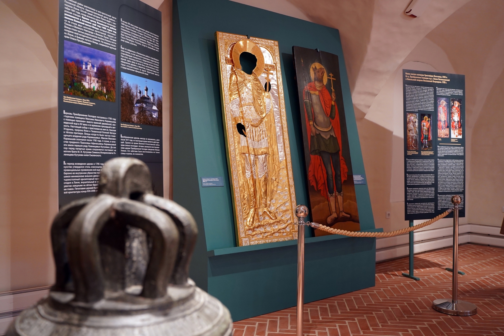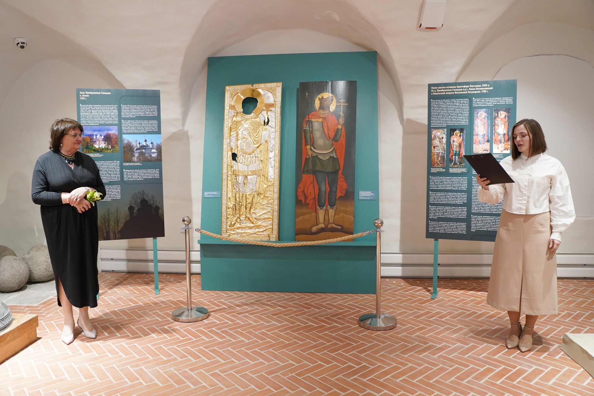 В Поганкиных палатах Псковского музея-заповедника состоялось открытие выставки «Тени древлего благочестия». Выставка презентует результаты сложной реставрационной работы в отношении иконы XVIII века «Св. воин-мученик Христофор Псеглавец» из церкви Спаса-Преображения Господня в поселке Локня Великолукской и Невельской епархии.