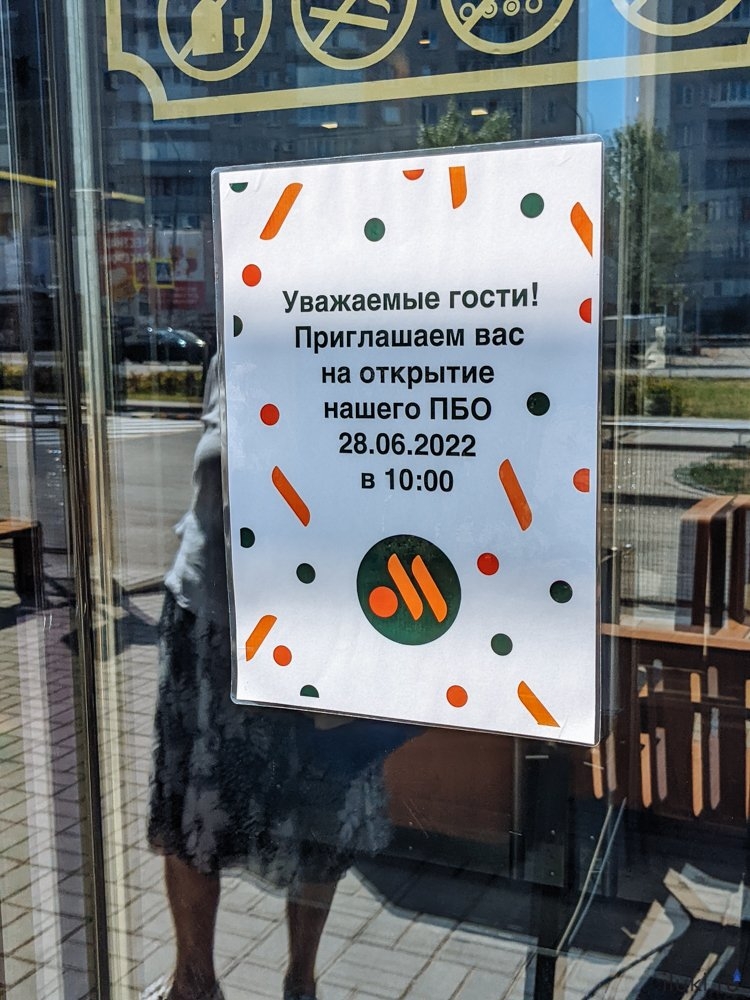 На окнах ресторана уже можно увидеть обновленные логотипы, выполненные в болотных тонах, которые пришли на замену яркой букве «M».