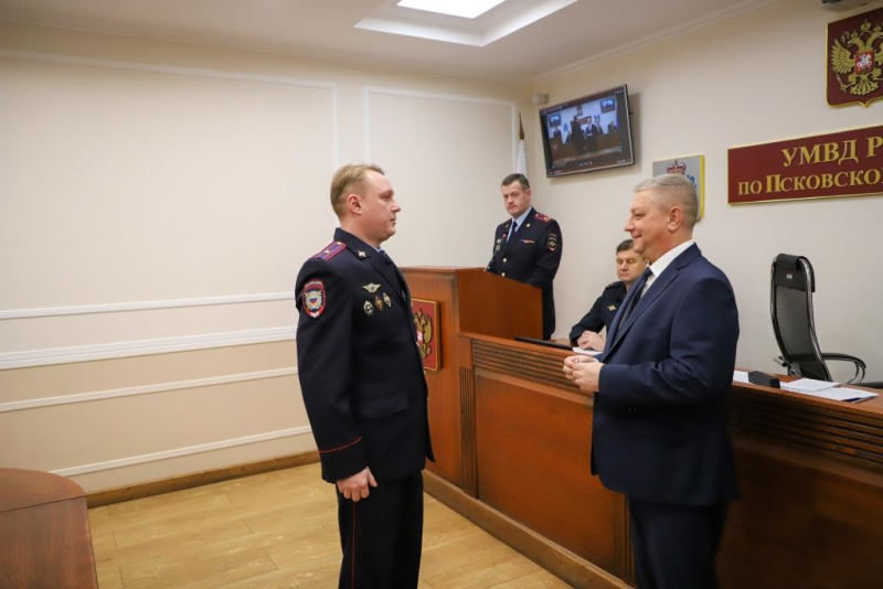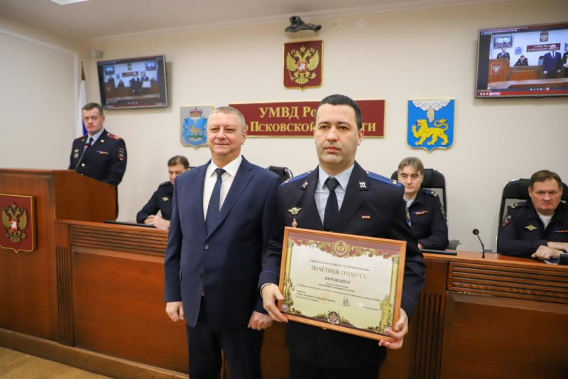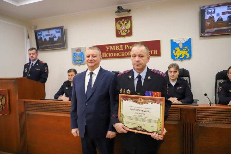 За умелую организацию работы, высокие показатели в служебной деятельности и образцовое выполнение служебного долга Алексей Викторович вручил награды отличившимся сотрудникам: медалью МВД России «За доблесть в службе» награждены подполковник полиции Илья Марков, заместитель начальника отдела участковых уполномоченных полиции и по делам несовершеннолетних ОМВД России по Псковскому району, подполковник полиции Вадим Михайлов, начальник отдела ЭКЦ УМВД и майор полиции Эллада Линник, оперуполномоченный по особо важным делам Управления уголовного розыска УМВД. Медалью МВД России «За боевое содружество» награждены майор полиции Вячеслав Петров, заместитель начальника полиции УМВД России по городу Пскову.