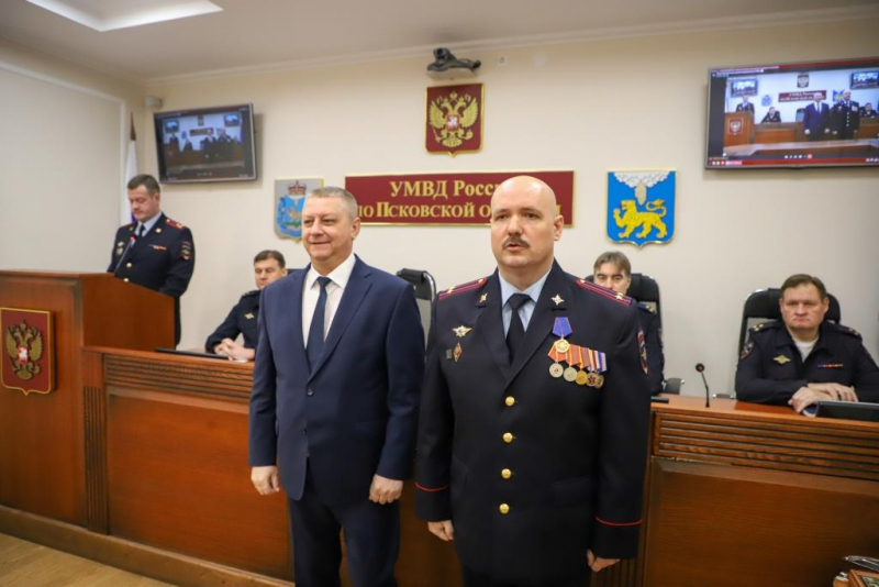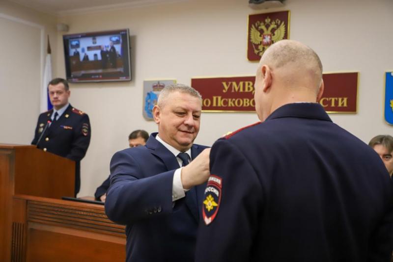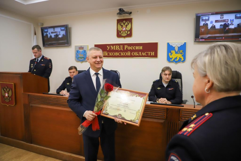 Перед началом торжественной церемонии награждения начальник Управления МВД России по Псковской области генерал-майор полиции Алексей Овсянников огласил собравшимся поздравительную телеграмму Министра внутренних дел Российской Федерации генерала полиции Российской Федерации Владимира Александровича Колокольцева.