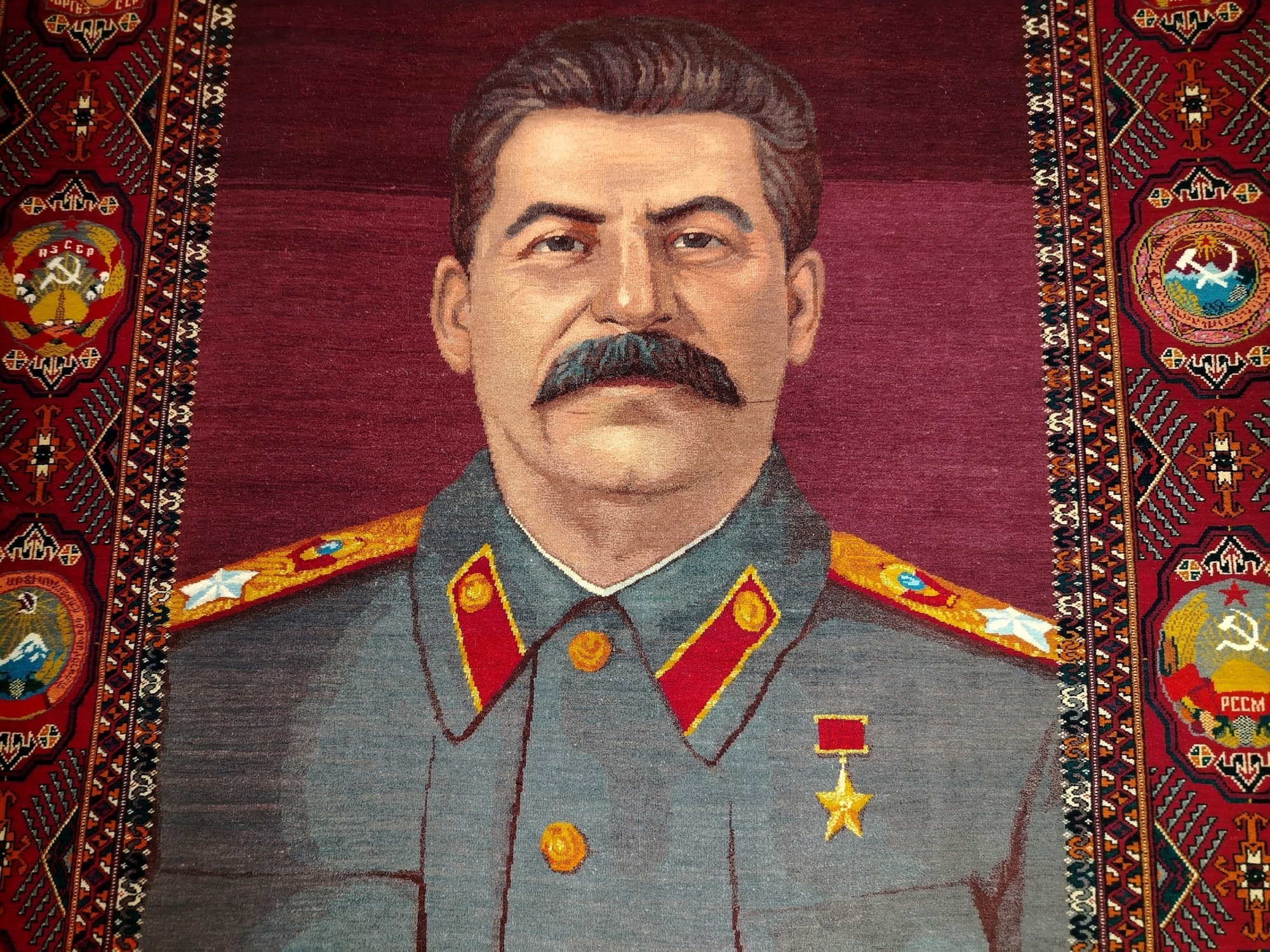 В Изборском музее продолжает работать выставка «Ковер историй».Начиная с 1930-х годов одним из постоянных сюжетов ковроткачества в СССР стали портреты известных исторических личностей и советских вождей, вписанные в традиционные ковровые орнаменты.
