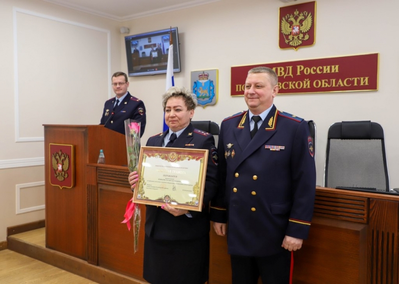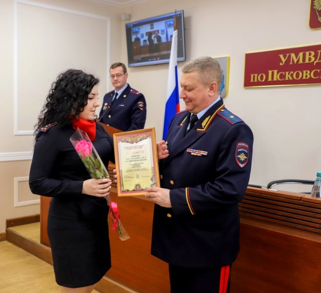 Заместитель начальника Управления по работе с личным составом УМВД России по Псковской области подполковник полиции Александр Збарашевский огласил праздничные приказы. Награды вручил начальник УМВД России по Псковской области генерал-майор полиции Алексей Овсянников.