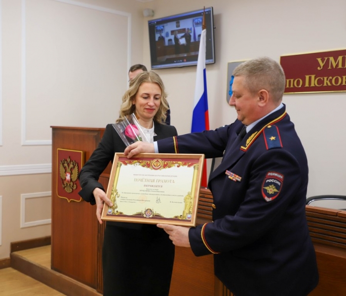 Почетной Грамоты МВД России удостоены капитан полиции Татьяна Нефедова – дознаватель УМВД России по городу Пскову, Олеся Трубачева – главный специалист - эксперт отделения психологической работы Управления по работе с личным составом УМВД, Юлия Алексеева – главный специалист Отдела организации применения административного законодательства Управления организации охраны общественного порядка УМВД.