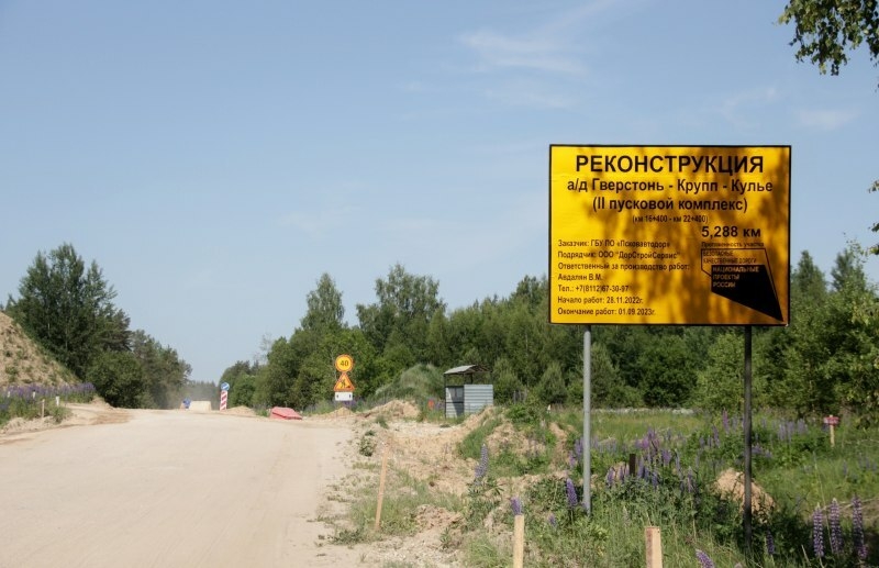 Первый пусковой комплекс, протяженностью 6,615 км, приводится в нормативное состояние в рамках реализации Государственной программы Псковской области «Развитие транспортной системы». На объекте уложено 6,5 км нижнего слоя асфальтобетонного покрытия основного хода дороги, ведутся работы по укреплению прибровочной части и откосов насыпи растительным грунтом, начаты работы по устройству посадочных площадок автобусных остановок.