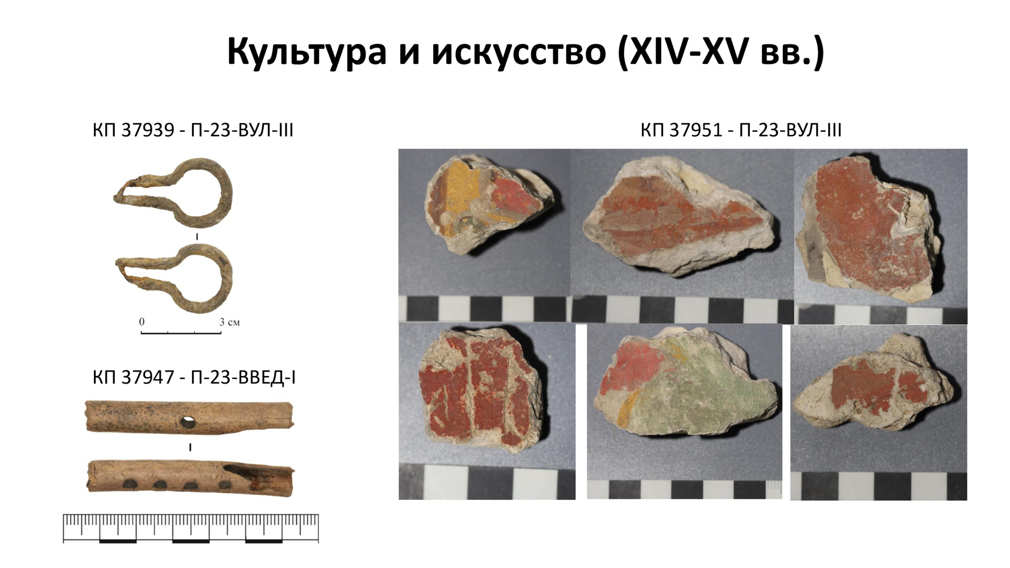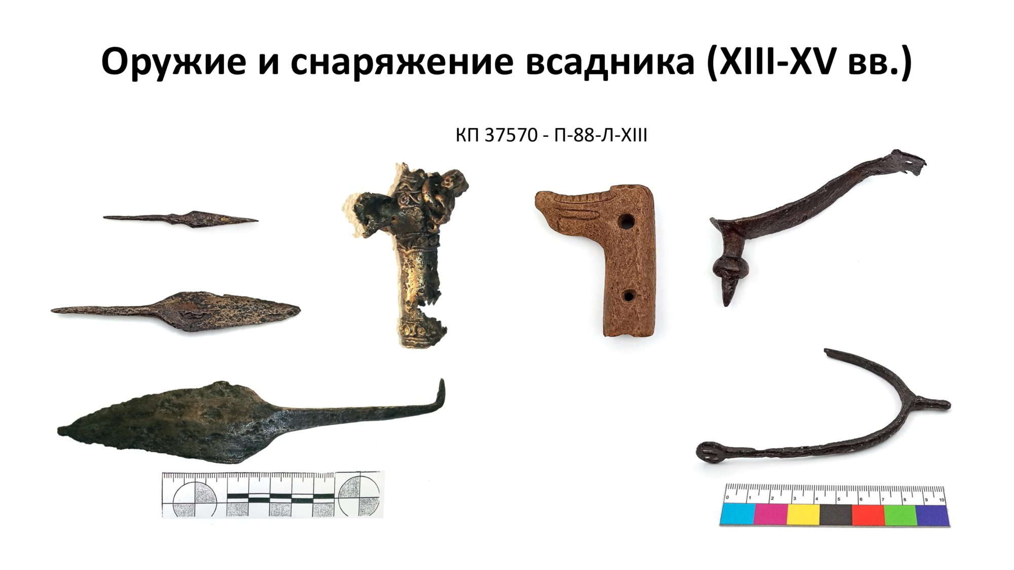 Среди находок – 10 вислых печатей, среди них самая ранняя (от конца XI до XV вв.), наконечники стрел и сулицы, шпоры и навершия плетей, несколько различных фрагментов костяных накладок на луку седла, одна из которых – с изображением крылатых волков – является произведением искусства.