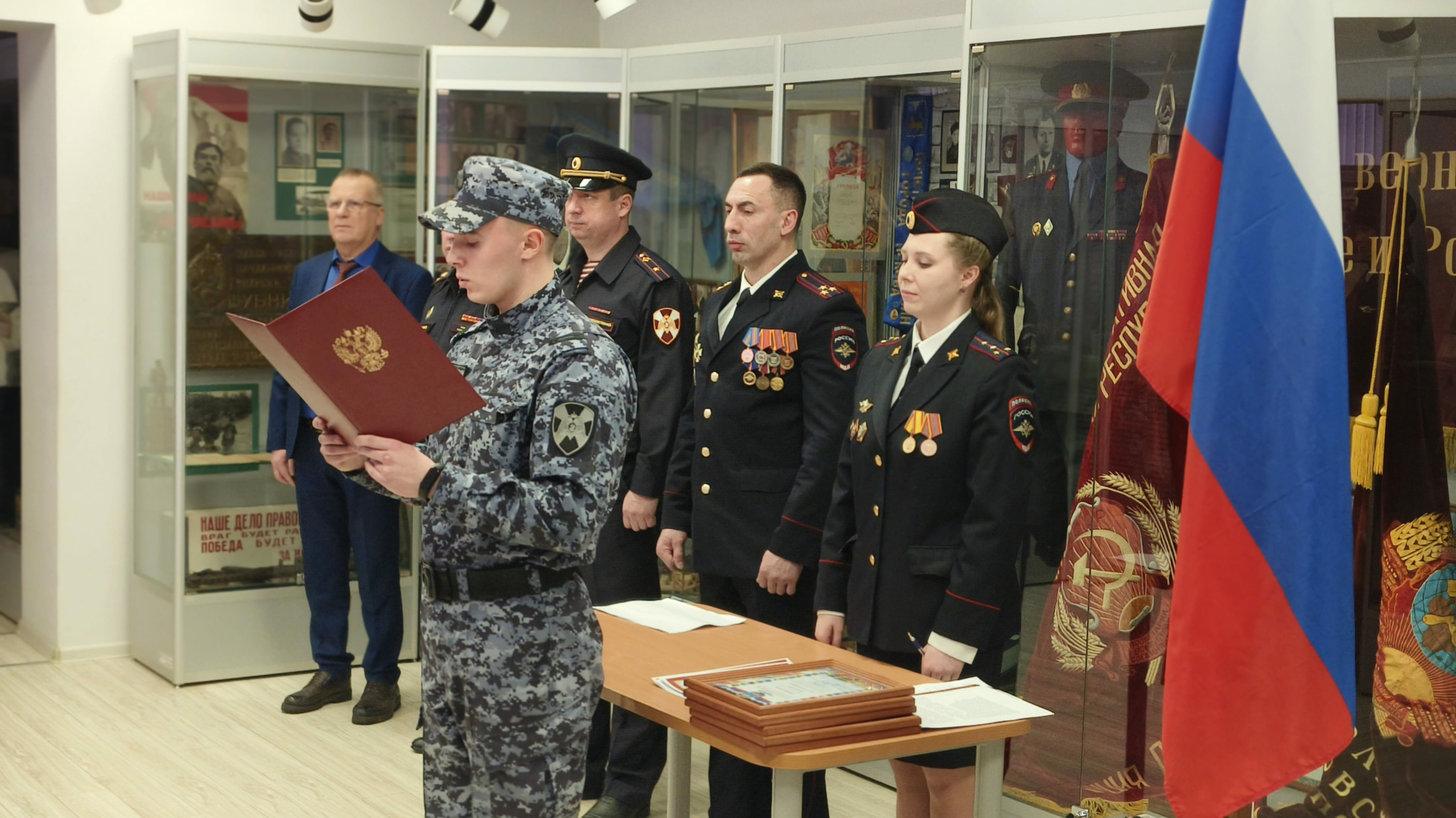 Клятву соблюдать законодательство, уважать права и свободы человека, быть честными и мужественными, не щадя своей жизни, охранять правопорядок произнесли 18 росгвардейцев.
