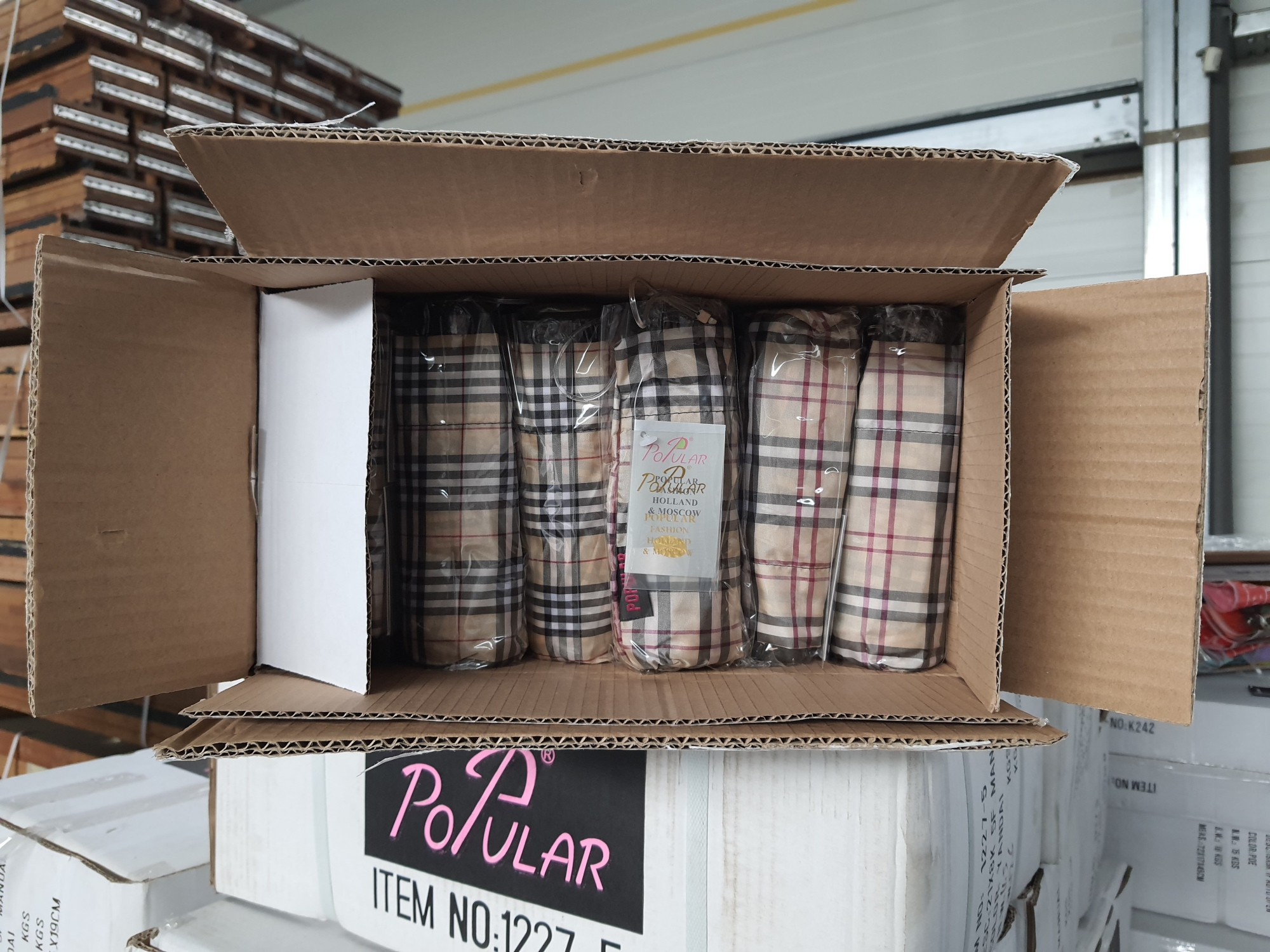 В коробках выявлено 1680 складных зонтов из полиэстера в индивидуальной прозрачной полиэтиленовой упаковке, с клетчатым цветным рисунком с обозначением, схожим с товарным знаком «Burberry Limited».