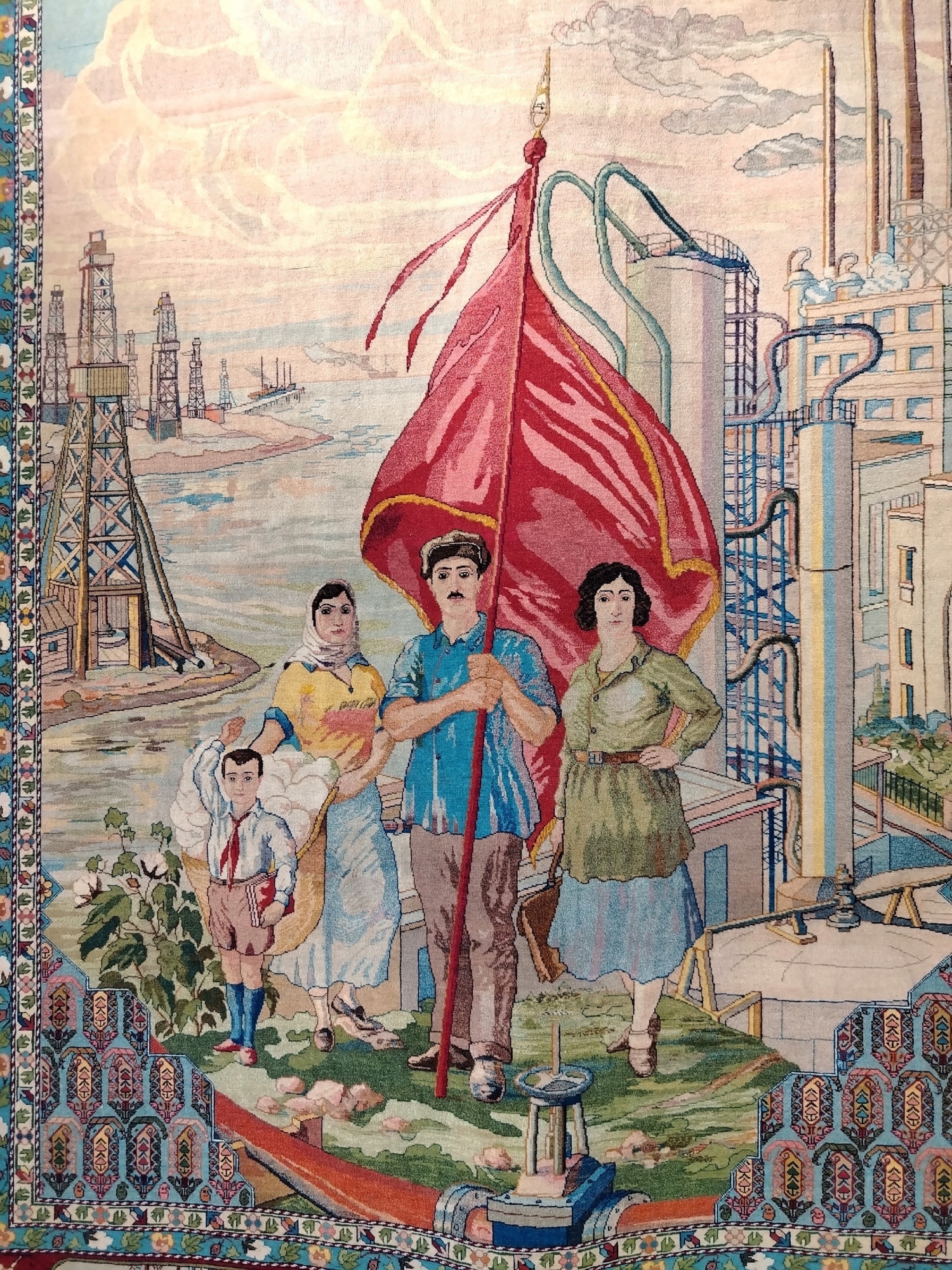 Ковёр выполнен в артели «Галибиет» в 1938 году по эскизу художника Людвига Книтта. В центральном поле этого ковра – яркое живописное полотно: салютующий пионер, рабочий-нефтяник с красным знаменем в руках, сборщица хлопка и женщина-инженер. По кайме в отдельных медальонах – сцены победившей новой жизни: от спортивных соревнований до архитектурных достопримечательностей. Малая кайма ковра – ритмически повторяющийся нефтепровод.