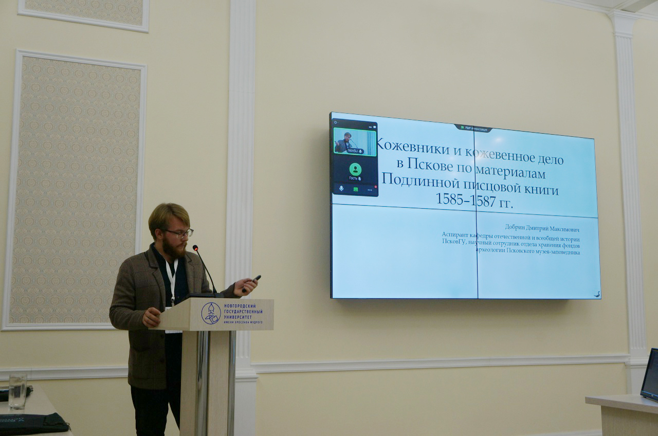 Научный сотрудник отдела хранения фондов археологии Дмитрий Добрин представил результаты исследования кожевенного дела по материалам Подлинной писцовой книги по Пскову 1585-1587 гг., в рамках которого были затронуты вопросы уровня развития ремесла, экономического состояния и организации ремесленников, топографии их расселения в городе. Результаты исследований будут в дальнейшем опубликованы.