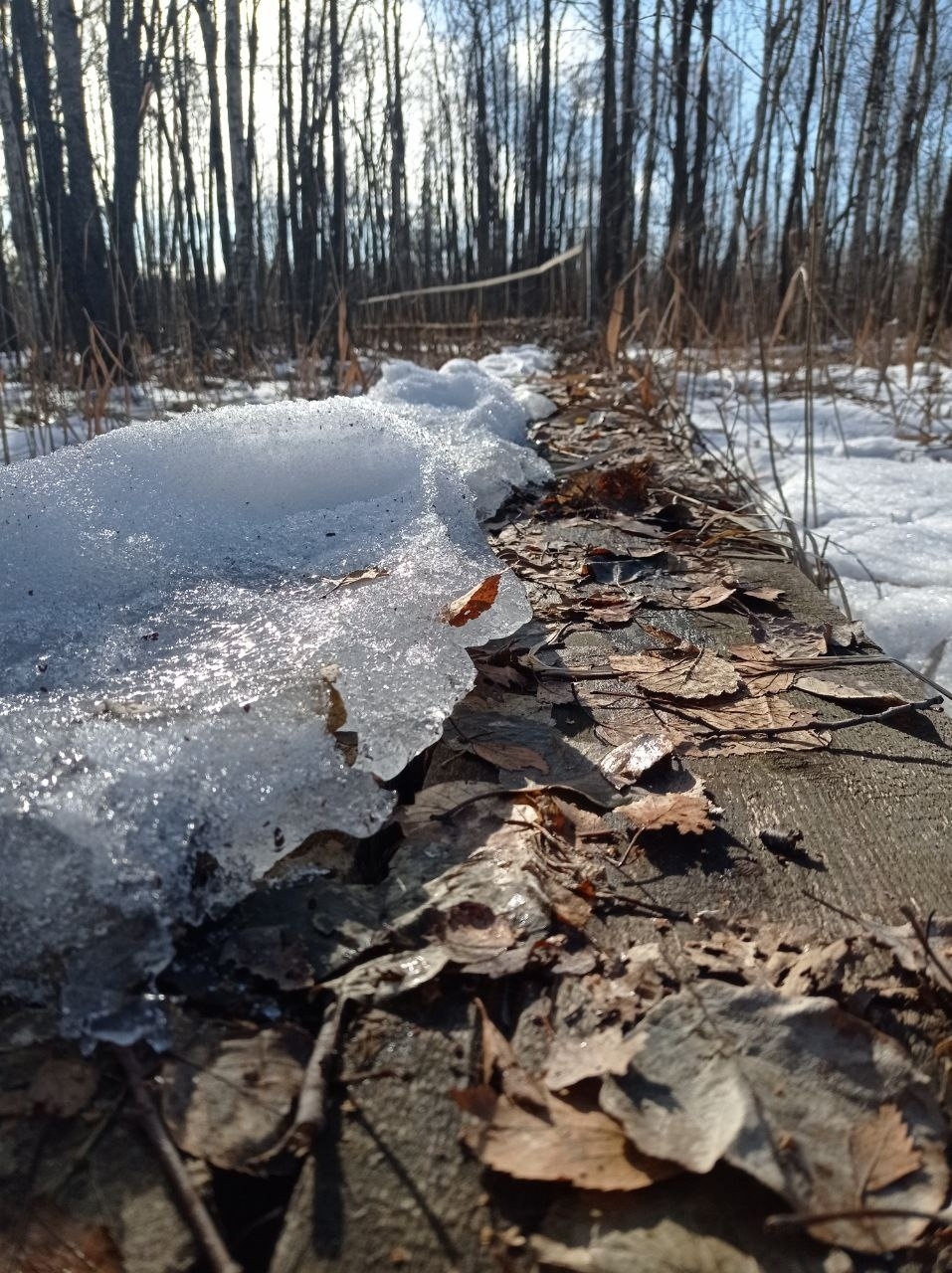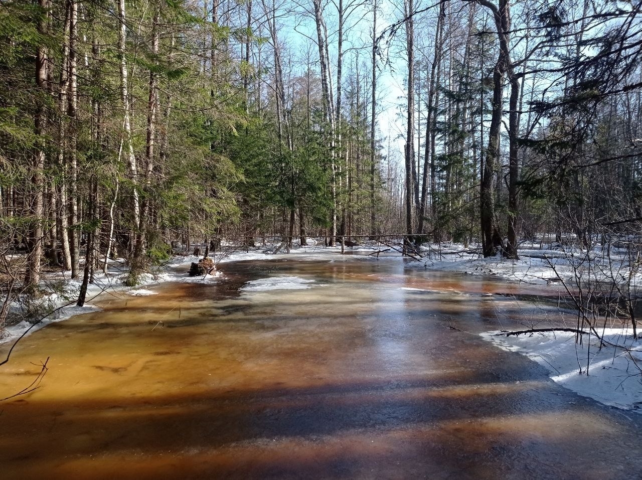 Здесь прошел лось - его видно по следам на снегу. Вот кусты ракиты, где косули организовали себе новую столовую, а вот старый ствол сосны, тут появилась очередная «кузница дятла». Из-под опавших листьев показались побеги молодых елочек, а на болоте - ягоды клюквы, вода в реках скованна льдом.