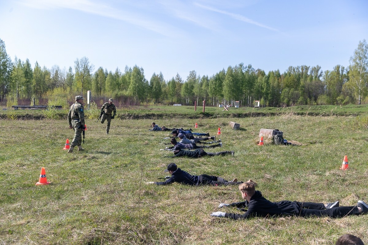 На полигоне Псковского соединения ВДВ школьники учились действовать в полевых условиях — передвигаться ползком, принимать правильную стойку с оружием и прочее.