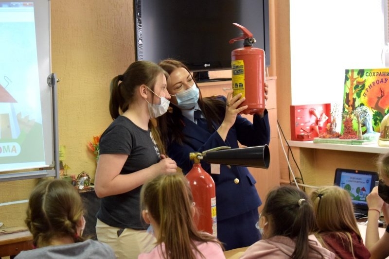 Под руководством представителя регионального отделения «Всероссийское добровольное пожарное общество» дети научились работать с разными типами огнетушителей и потренировались ликвидировать возгорание бытового электроприбора.
