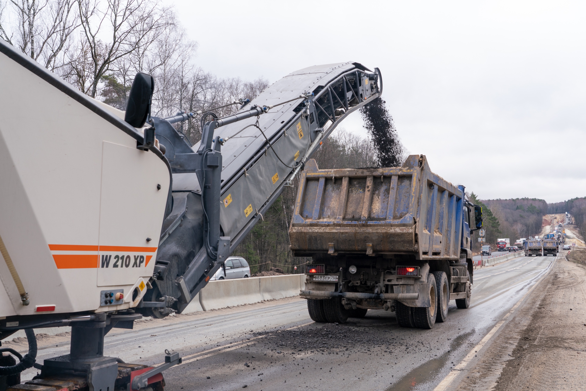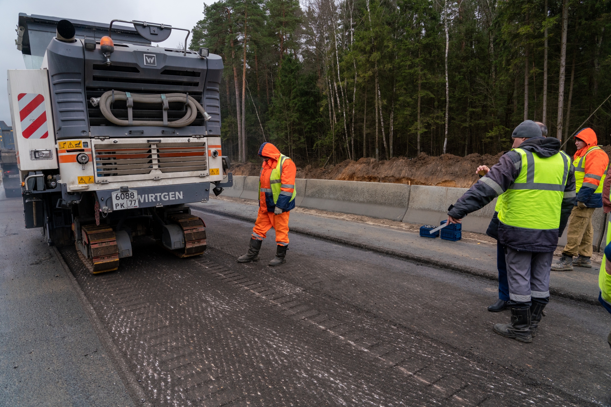 На данном участке будет увеличено количество полос движения с двух до четырех, и в настоящее время дорожники проводят фрезерование изношенного покрытия как раз с использованием новых отечественных комплектующих.