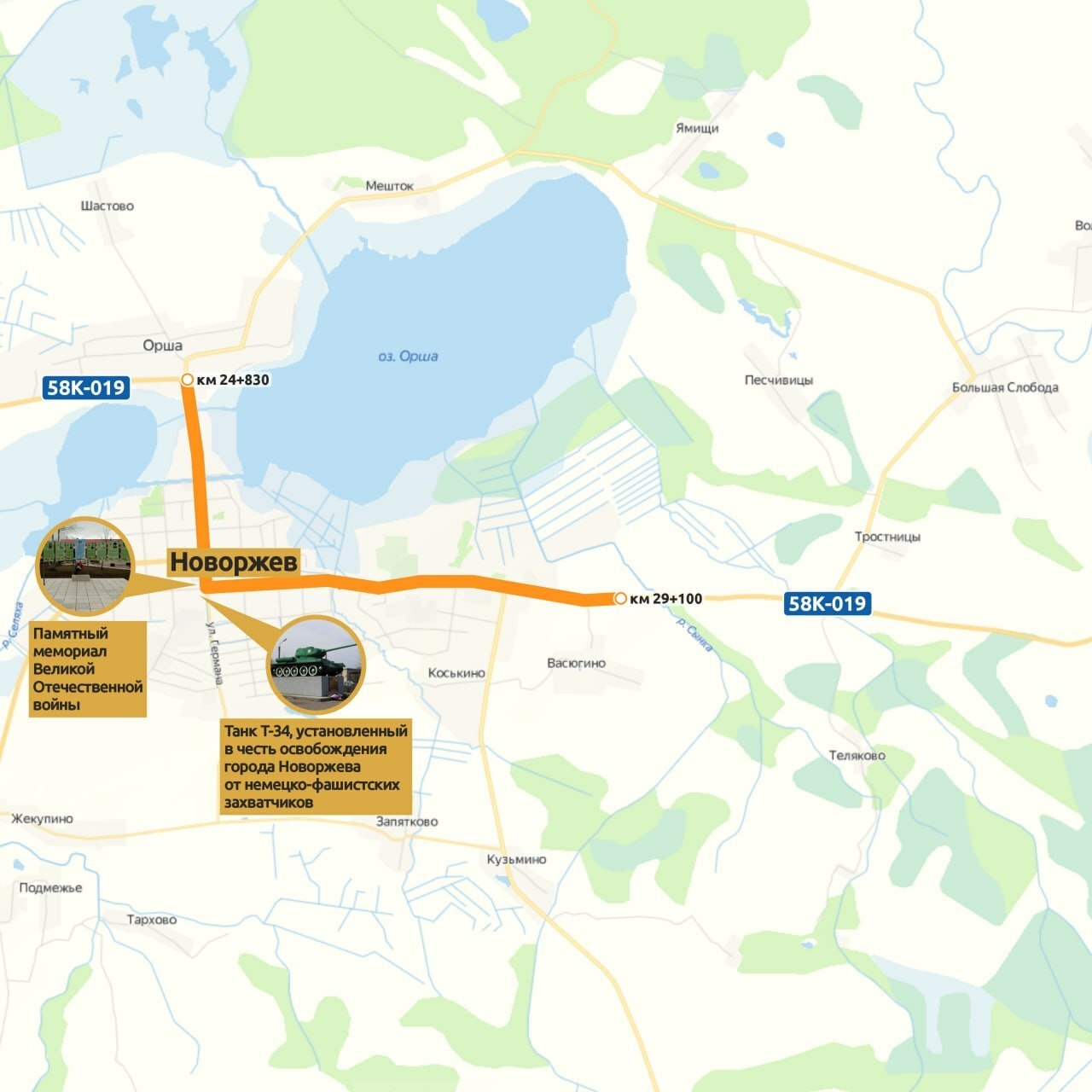 Среди них 4,2 км участок автомобильной дороги Пушкинские Горы – Локня (км 24+830 – км 29+100), который проходит в городе Новоржев. В самом центре города, вдоль ремонтируемой трассы, расположены памятный мемориал героям Великой Отечественной войны и танк Т-34, установленный в честь освобождения города Новоржева от немецко-фашистских захватчиков. К ремонту участка планируется приступить уже в этом году.