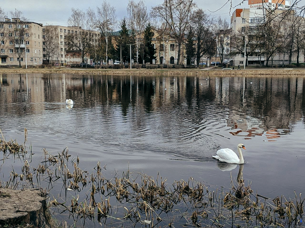 Жители Великих Лук обратили внимание на необычное для городской среды явление – на набережной реки Ловать появились лебеди.