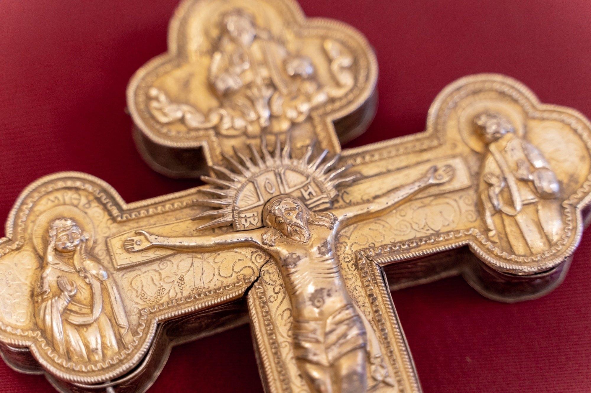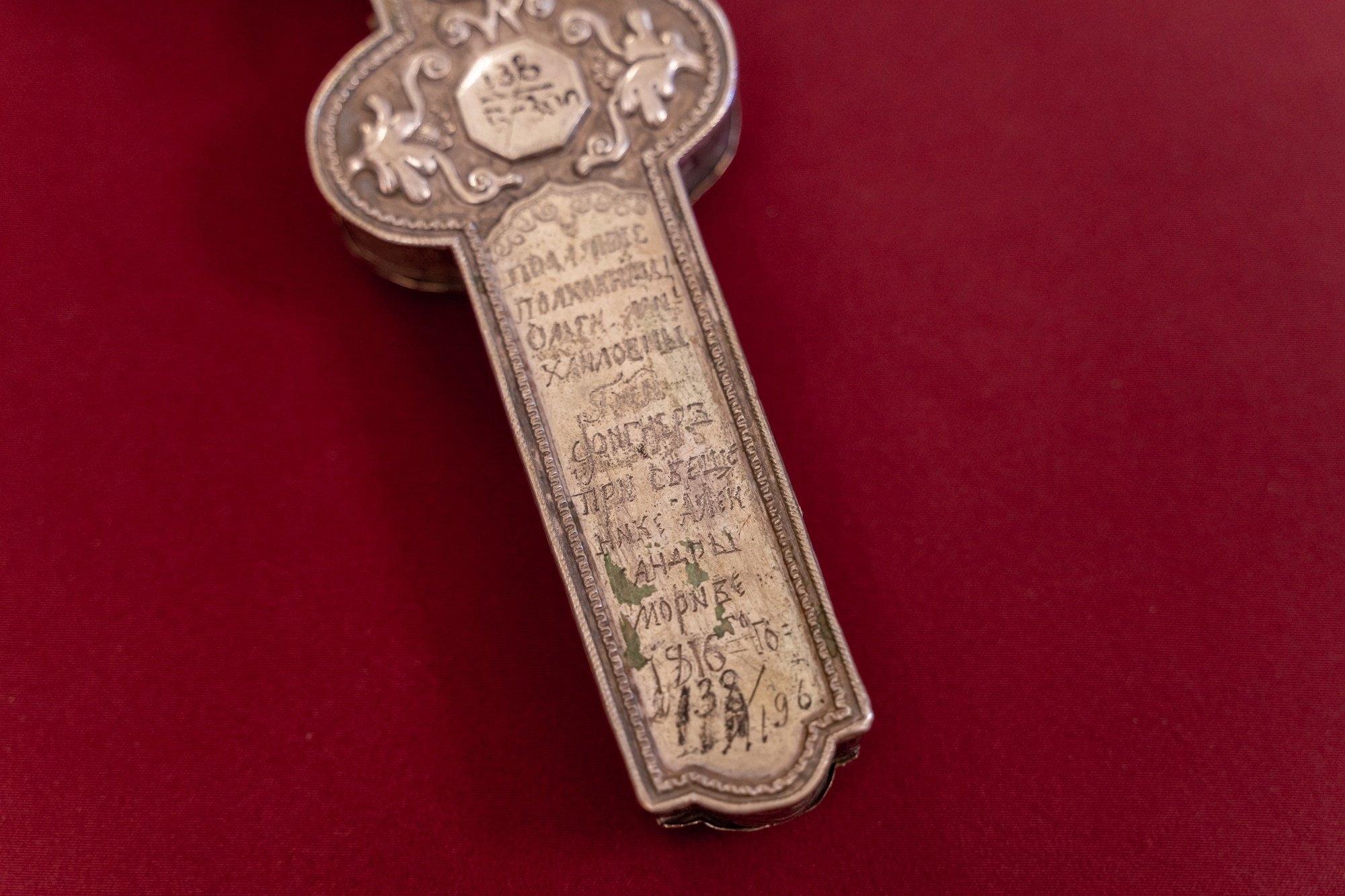 Одним из таких экспонатов является напрестольный крест конца XVII – начала XVIII века. На деревянную основу креста наложены серебряные позолоченные пластины с чеканным распятием на лицевой стороне. На рукояти находится чеканный растительный орнамент, который повторен в технике резьбы на боковых гранях креста. Оборот креста – серебряный, имеет шесть гладких медальонов, на которых могли бы быть написаны слова о святынях, вложенных в этот крест. На рукояти присутствует вкладная надпись: «Подаяние полковницы Ольги Михайловны, госпожи Фигнер. 1816 год».