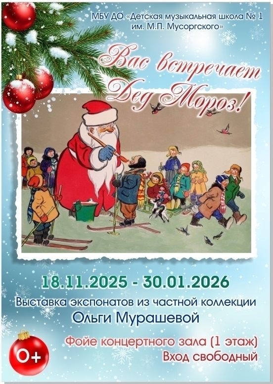 С 18 ноября 2025 года по 30 января 2026 года в музыкальной школе № 1 им. М. П. Мусоргского работает выставка экспонатов из частной коллекции Ольги Мурашевой: «Вас встречает Дед Мороз!».