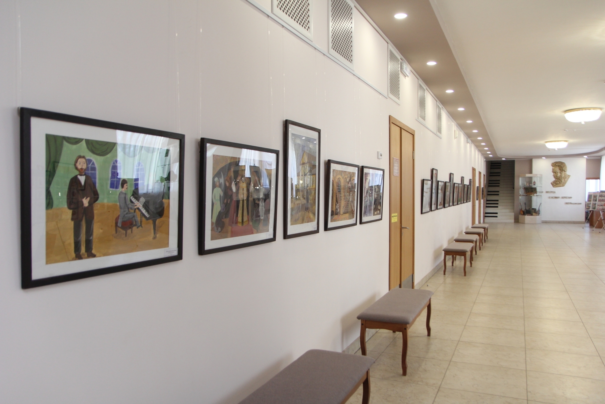 Ко Дню рождения М.П. Мусоргского в фойе концертного зала великолукской музыкальной школы №1 открылась выставка работ победителей Международного конкурса юных художников «Картинки с выставки» разных лет из фондов ДШИ «Центр».