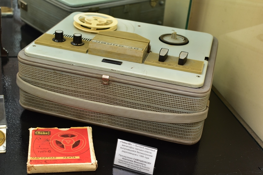 Есть магнитофон «Чайка-66» - когда-то гордость Великолукского радиозавода, выпускавшаяся с 1966 года. Рядом - сувенирный радиоприёмник «Regatt» из Таллина (1980 год), подсвечник-сувенир с завода «Электробытприбор», подарочный альбом фотографий к 20-летию освобождения города от немецко-фашистских захватчиков, медаль к 40-летию подвига Александра Матросова.