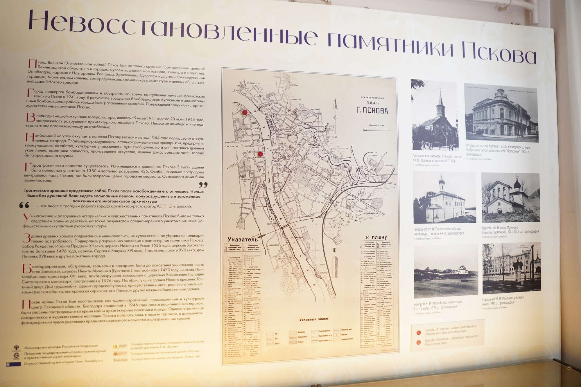 Выставочный проект состоит из 12 комплексов, объединенных одной темой, – судьбой погибших во время Великой Отечественной войны средневековых памятников архитектуры и ценных общественных зданий города Пскова.