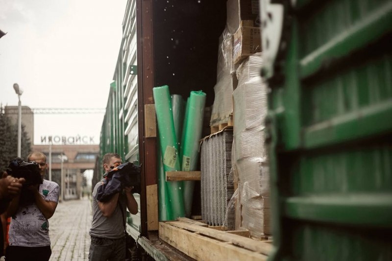 В Донецке состав встречали представители республиканской железной дороги и Народного фронта. Сопровождающий гуманитарный груз депутат Государственной думы Анатолий Лесун рассказал, что помочь российские железнодорожники захотели сами, из личных сбережений. «Благотворительный фонд «Почет» открыл специальный счет, куда любой желающий железнодорожник может перечислить любую сумм денег. Фонд организовал закупку стройматериалов. В ДНР доставлено всего восемь вагонов. четыре вагона с кирпичами, вагон с пиломатериалом, три вагона с цементом, шифером, щебенкой. Все это пойдет на восстановление жилья железнодорожников прежде всего», - рассказал парламентарий.