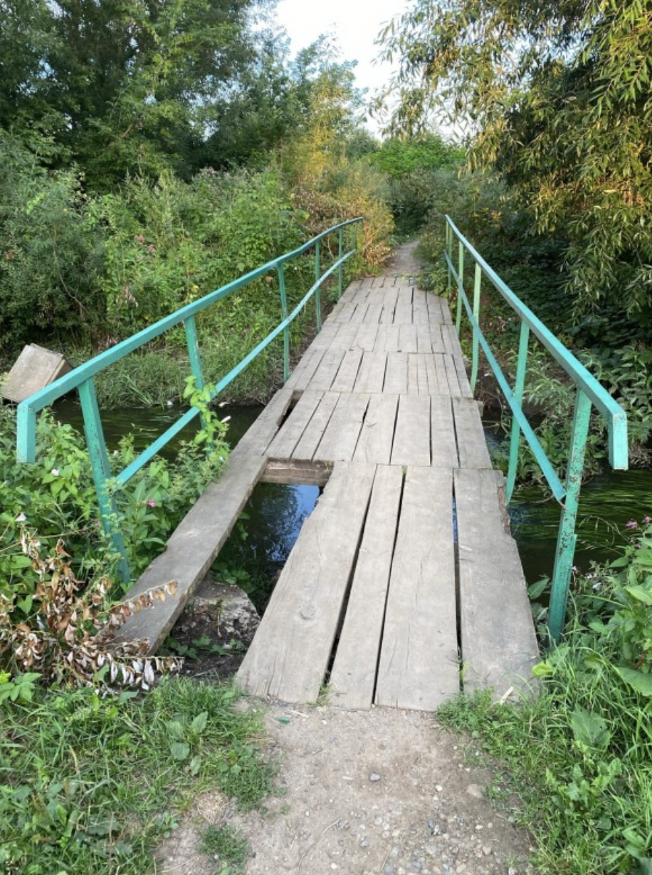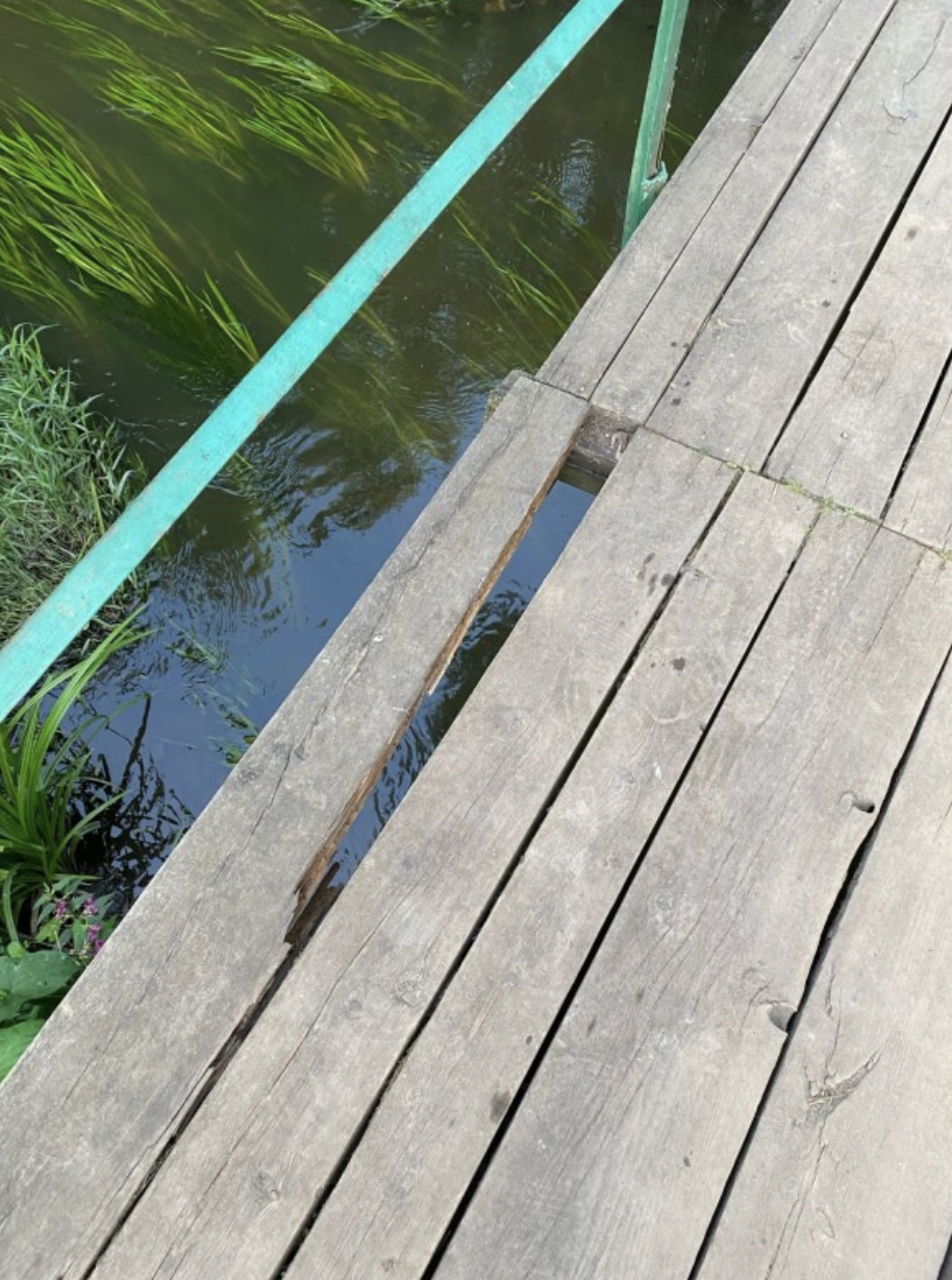 «Мосты сгнили, доски просто лежат на гнилых брусьях, где-то вообще отсутствуют. Вокруг мостов все зарасло травой и деревьями, из-за этого их облюбовали местные пьянчужки. Речка также находится в отвратительном состоянии, не чистили ее уже лет 10 точно.